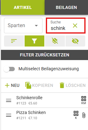Zum Bearbeiten eines Artikels, wählt man diesen rechts in der Liste aus. Man kann auch das Suchfeld benutzen, um Artikel schneller zu finden: