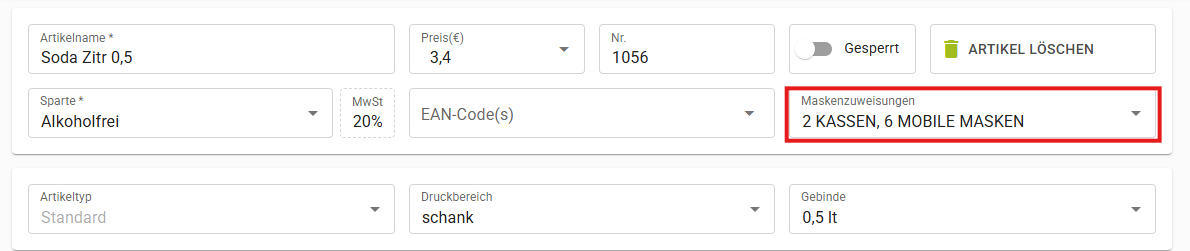 Im oberen Bereich sieht man unter Maskenzuweisungen, welchen Masken der geöffnete Artikel zugeordnet ist.