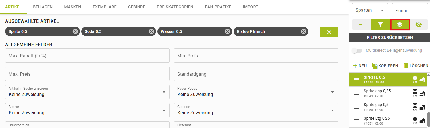 Mit dem "Auge" Button können die Sparten der jeweiligen Artikel angezeigt werden, wenn mehrere Artikel ausgewählt sind.