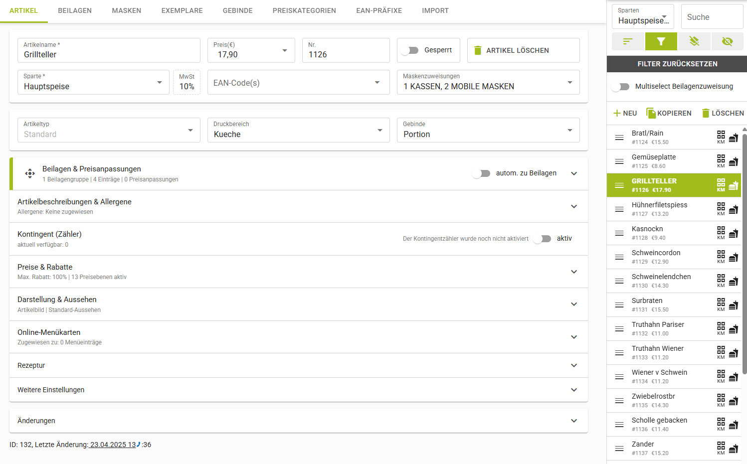 | Als Beilage bonierbar | Trifft die Auswahl, was im Beilagenmodus gewählt werden kann. |