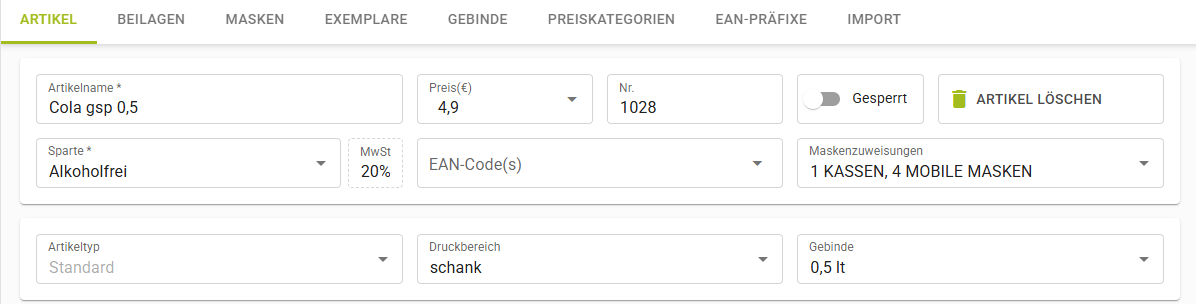 | EAN Code | Bei Verwendung eines Barcodescanners zum Bonieren von Artikeln, muss der EAN-Code hier eingetragen werden. |