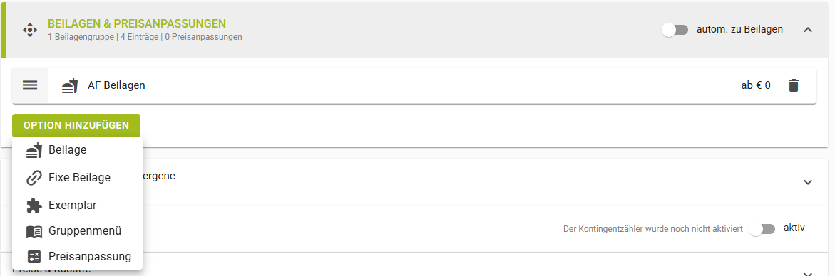 Option hinzufügen | Weiters können hier dem Artikel Beilagen, fixe Beilagen, Exemplare, Gruppenmenüs und Preisanpassungen zugewiesen werden über den "Option hinzufügen" Button. |