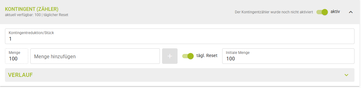 | Kontingentzähler aktiv | ACHTUNG: wenn das Kontingent erschöpft ist, kann der Artikel nicht mehr boniert werden! |