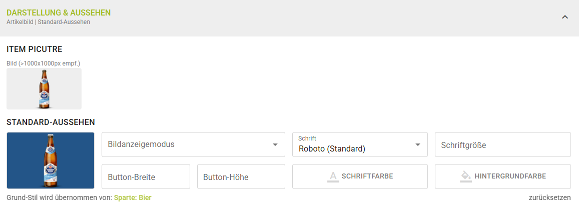 Hier kann ein eventuell vorhandenes Artikelbild eingefügt werden oder das Aussehen auf der Artikelmaske festgelegt werden (wenn der Artikel neu auf einer Maske eingefügt wird). Standardmäßig werden die Einstellungen der Sparten übernommen.