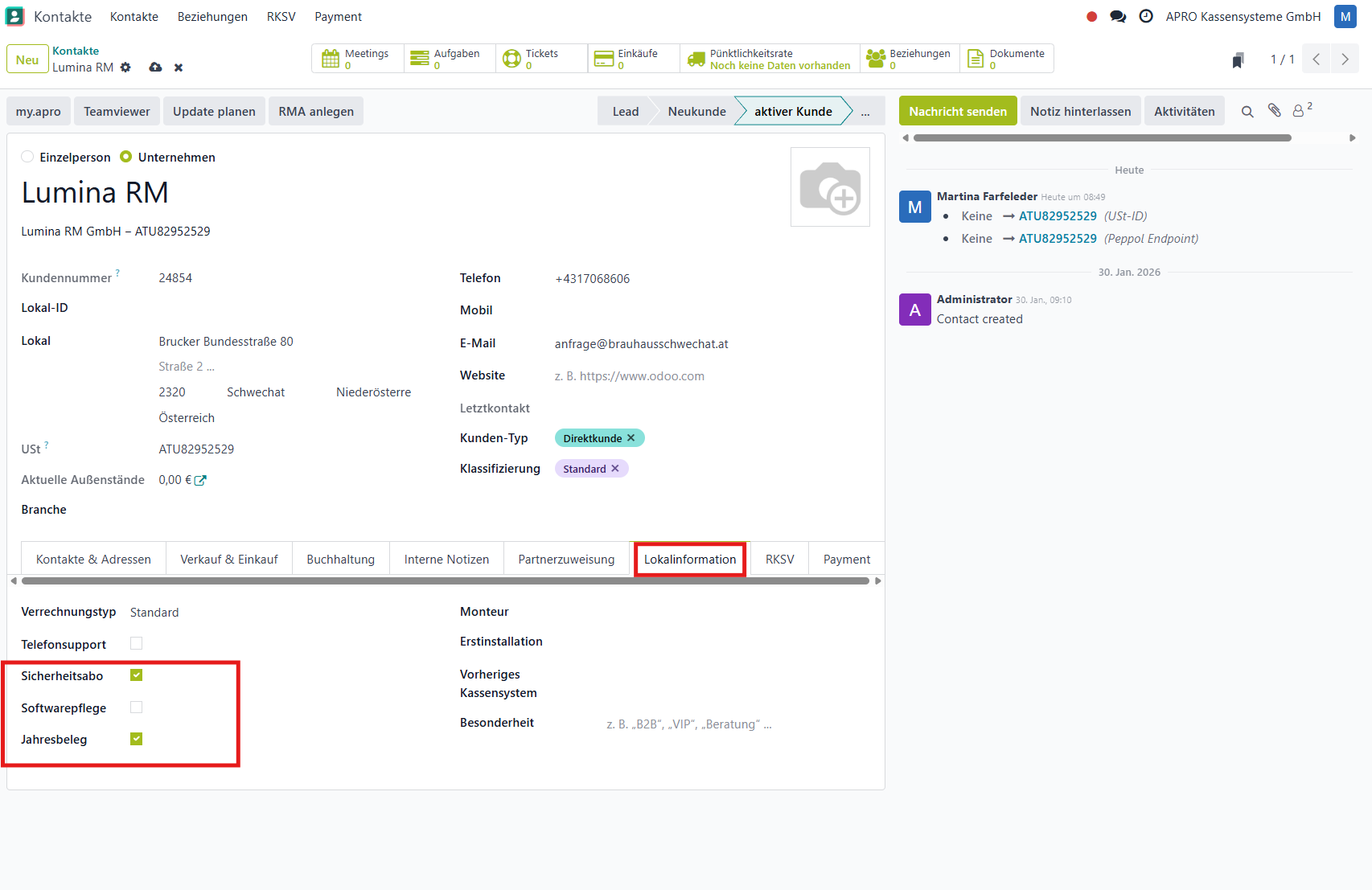 Beim Kunden im Reiter "Lokalinformationen" noch anhakerln, ob ein Sicherheitsabo gewünscht + Jahresbelegprüfung gebucht wurde (z.B: "Pro" im ERP = 2 Häkchen in Odoo)