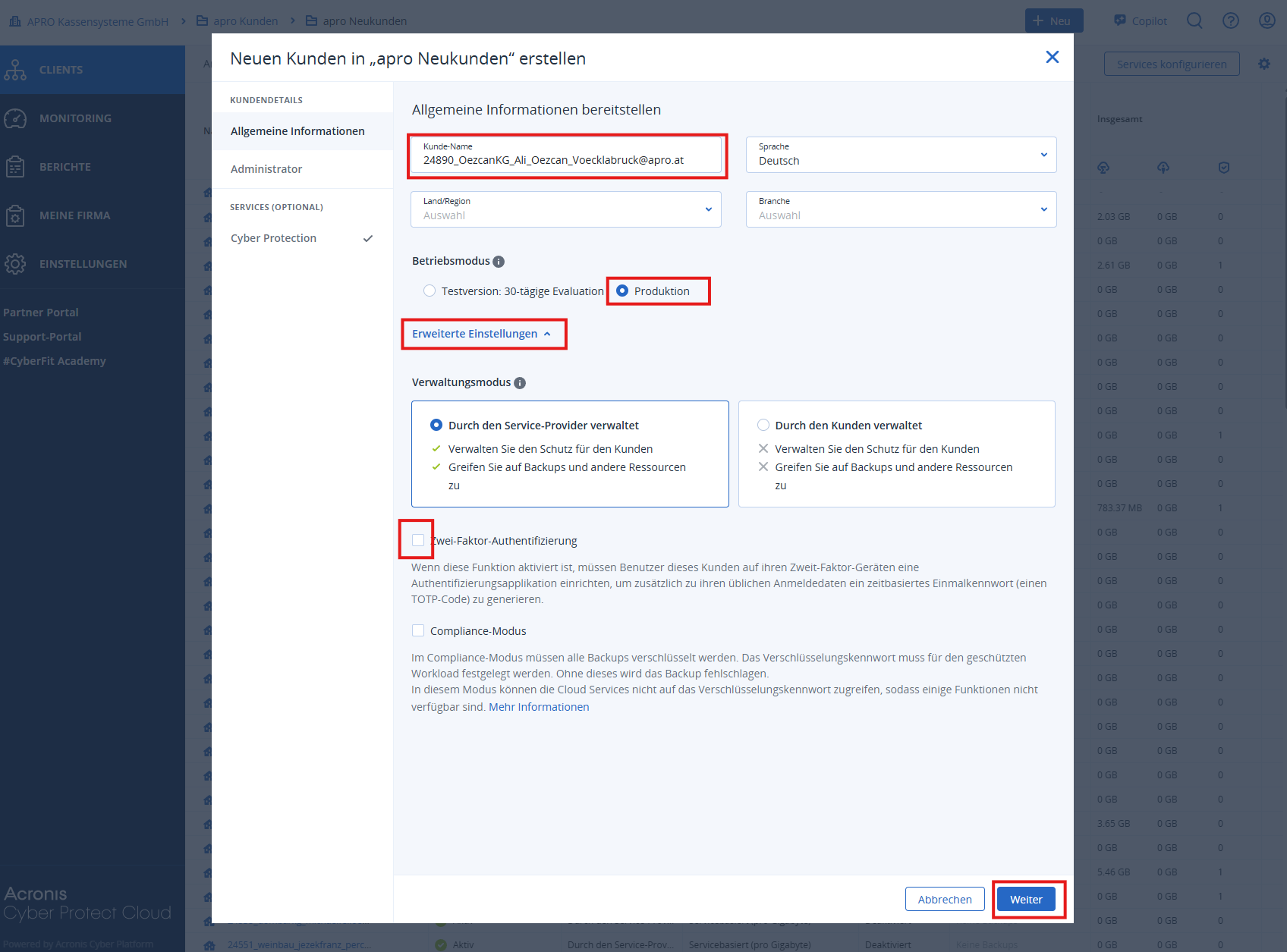 Danach Einstieg ins Acronis > Ordner "Apro Kunden" > "apro Neukunden":